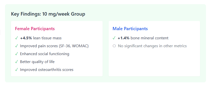 | PEARL | Healthy adults (50-85) | 5-10mg/week | Improved muscle in women; bone in men; safe for 48 weeks. |