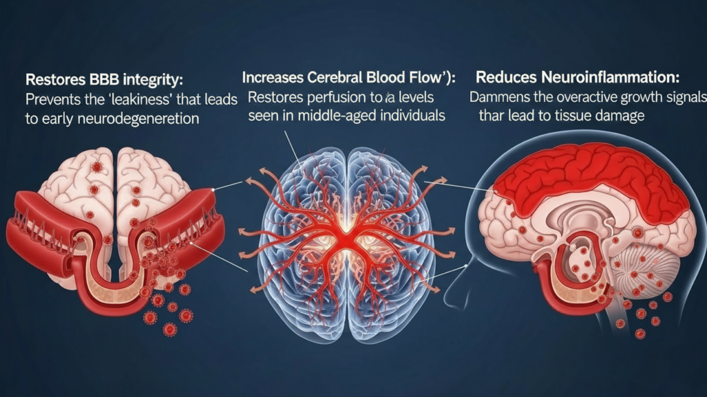 Researchers have identified that mTOR inhibition via Rapamycin can reduce proinflammatory pathways in the brain’s vasculature. By tightening the blood-brain barrier and improving blood circulation, Rapamycin may help the brain clear toxic proteins more effectively.
